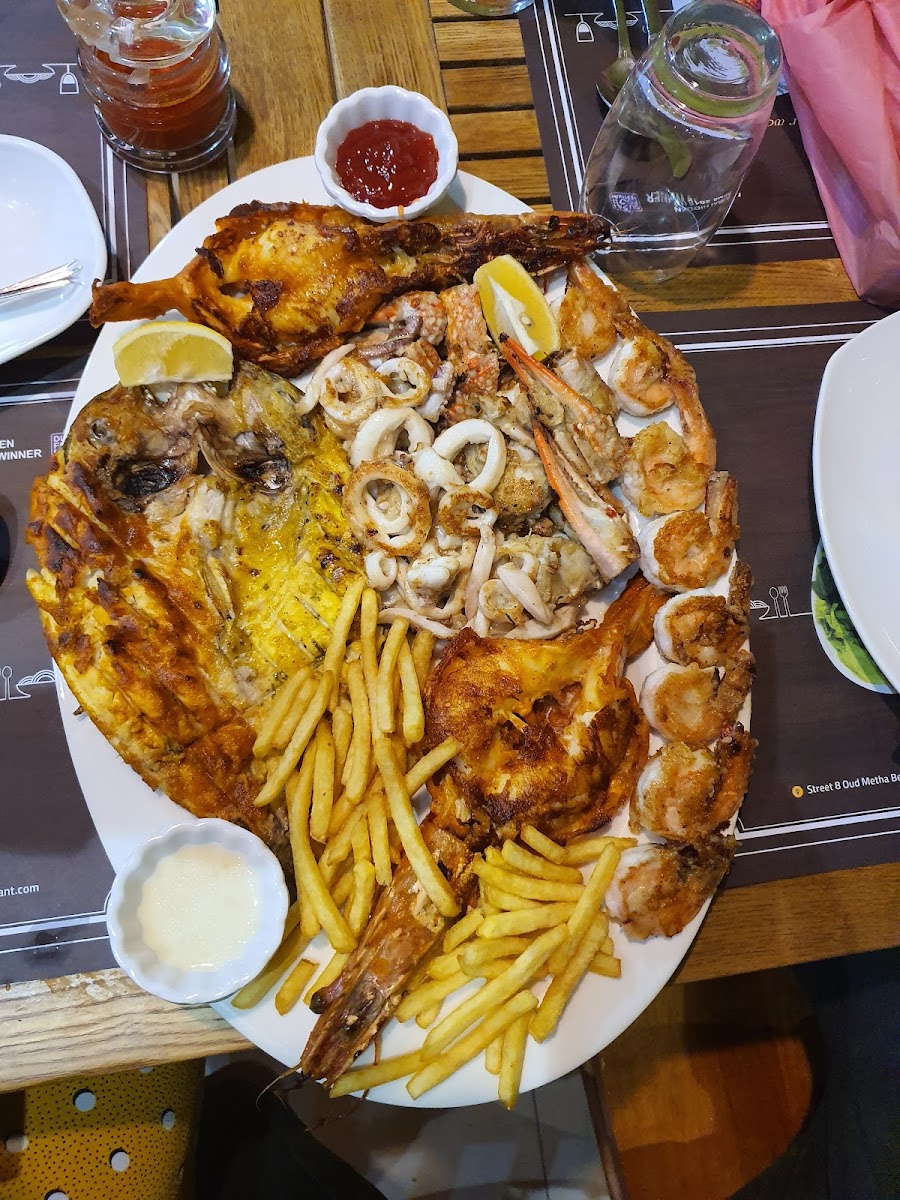Fish Hut Restaurant in Oud Metha offers a straightforward, no-frills seafood dining experience centered on freshness and choice. This is the kind of spot where you pick your fish first—whether it’s red snapper, pomfret, or seabream—and then decide how you want it cooked, from pan-grilled to tawa fry, complemented by sauces like lemon or peri peri. The menu leans heavily on classic seaside flavors, including standout dishes like fish and chips, crab roast, and a variety of grilled prawns.